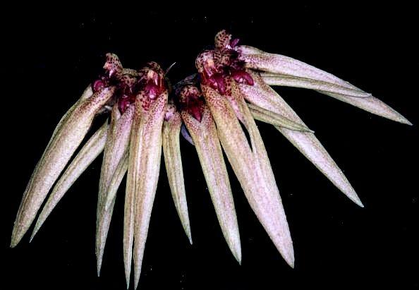 Found in Myanmar and Thailand as a small sized, warm to cool growing epiphyte that likes an ample water supply. This species has been commonly mislabeled as B picturatum and differs in the size of the flowers and the broadly triangular-ovate petals that have a blunt apex and are never hirsute.