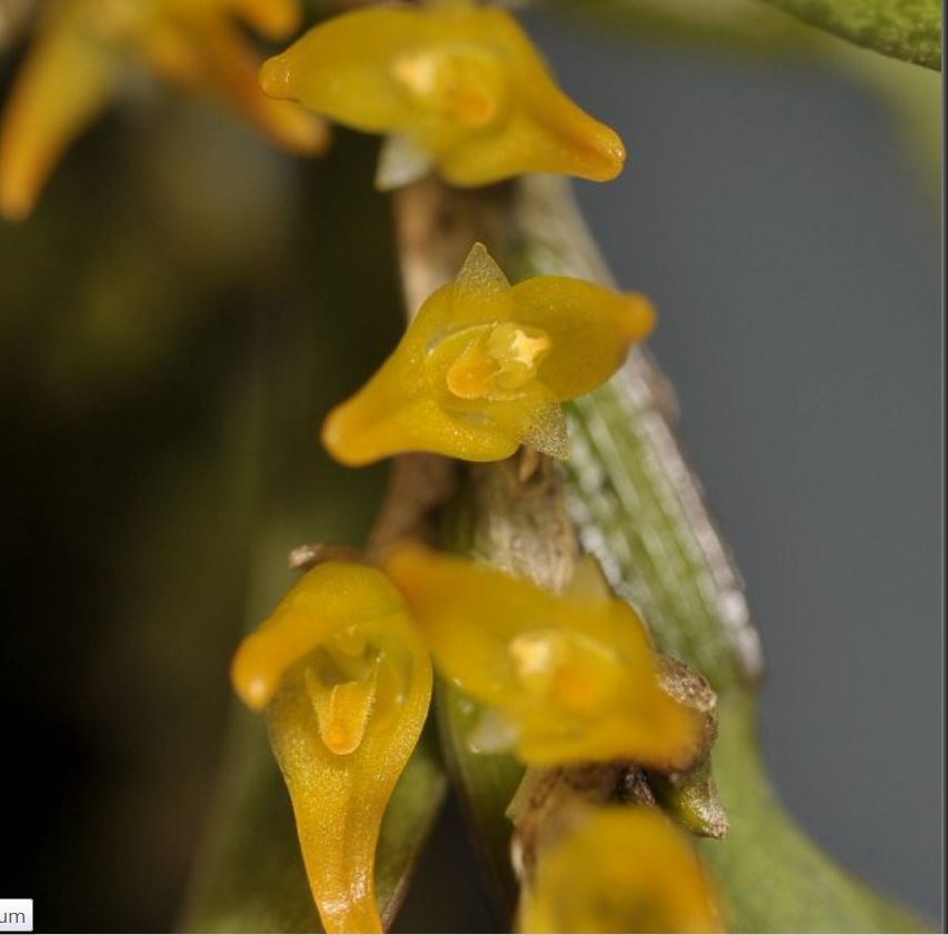 Found in New Guinea in lowland forest at elevations of 30 to 300 meters as a mini-miniature sized, hot growing epiphyte with a pendulous, apex curved upwards, thin rhizome giving rise to spirally arranged, .12 to .2" [.3 to .5 cm] apart, making an acute angle with the rhizome, subconical-cylindrical, adnate to the rhizome, strongly oblique, longitudinally ribbed pseudobulbs carrying a single, apical, narrowly lanceolate, acute, convex, somewhat fleshy, base narrowed, above on either side of the midrib grooved, convex, dorsally obtusely angled leaf and blooms in the spring on many, from the nodes of the rhizome, very short, ; peduncle .12 to .132" [.3 to .33 cm] long, entirely covered by small membranous sheaths, single flowered inflorescence with acuminate, concave, membranous, furfuraceous-punctate, clasping the much smaller ovary floral bracts