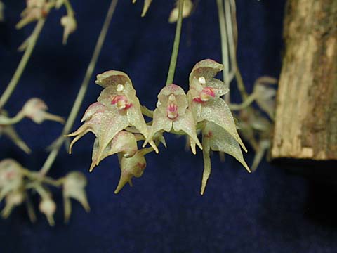 Found in Vietnam, India, Laos and China in evergreen broad-leaves primary forests and mixed forests at elevations of 500 to 1650 meters as a mini-miniature sized, warm to cool growing epiphyte with a creeping, much branching rhizome giving rise to close set, ovoid to conical, ribbed, dark green pseudobulbs carrying a single, erct, fleshy, flexible, thinly leathery, narrowly ovate, acute to obtuse, minutely punctate, and purple suffused beneath, petiolate base leaf that blooms in the spring and summer on an erect to suberect, sometimes reddish, laterally from the base, wiry, 3" [7.5 cm] long, to 8 flowered inflorescence arising on old and new pseudobulbs that has an apical cluster of simultaneously opening, fragrant [foul] flowers.