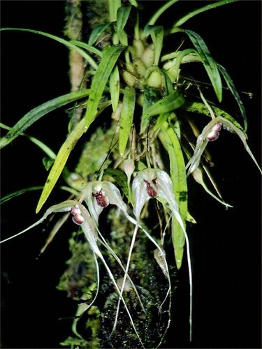 Found in eastern New Guinea at elevations of 2500 to 3000 meters as a mini-miniature sized, cold growing epiphyte with a creeping rhizome giving rise to ovoid pseudobulbs and carrying a single, apical, erect, elliptic, acute, narrowing below into the petiolate base leaf that blooms in the fall and winter in nature and in the spring in cultivation on a basal, to 5.2" [to 13 cm] long, single flowered inflorescence with tubular, acuminate floral bracts.