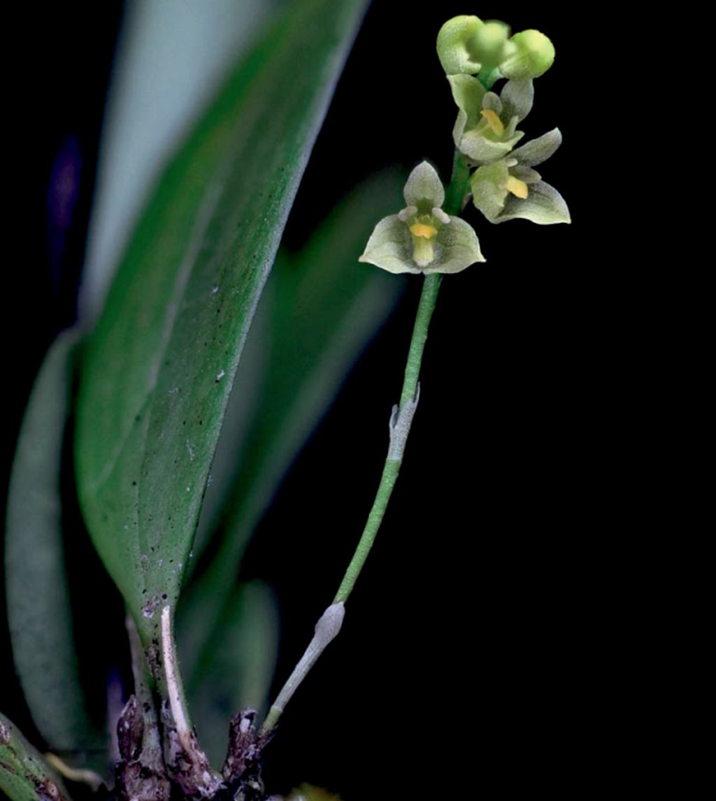 Found in the Philippines on Mindanao Island on mossy branches at elevations around 1200 meters as a mini-miniature sized, cool growing epiphyte with erect, clustered, globose pseudobulbs carrying a single, lanceolate, flattened, apex emarginate, adaxially and abaxially glabrous, margins entire, cuneate below into the glabrous, grooved, petiolate base leaf that blooms in the late winter and early spring on an axillary, erect, peduncle acicular, .76" [1.9 cm] long, racemose, up to 1" [2.5] long, rachis erect, to 6 flowered inflorescence with triangular, persistent, glabrous, green, shorter than the ovary floral bracts and carrying resupinate, non fragrant flowers.