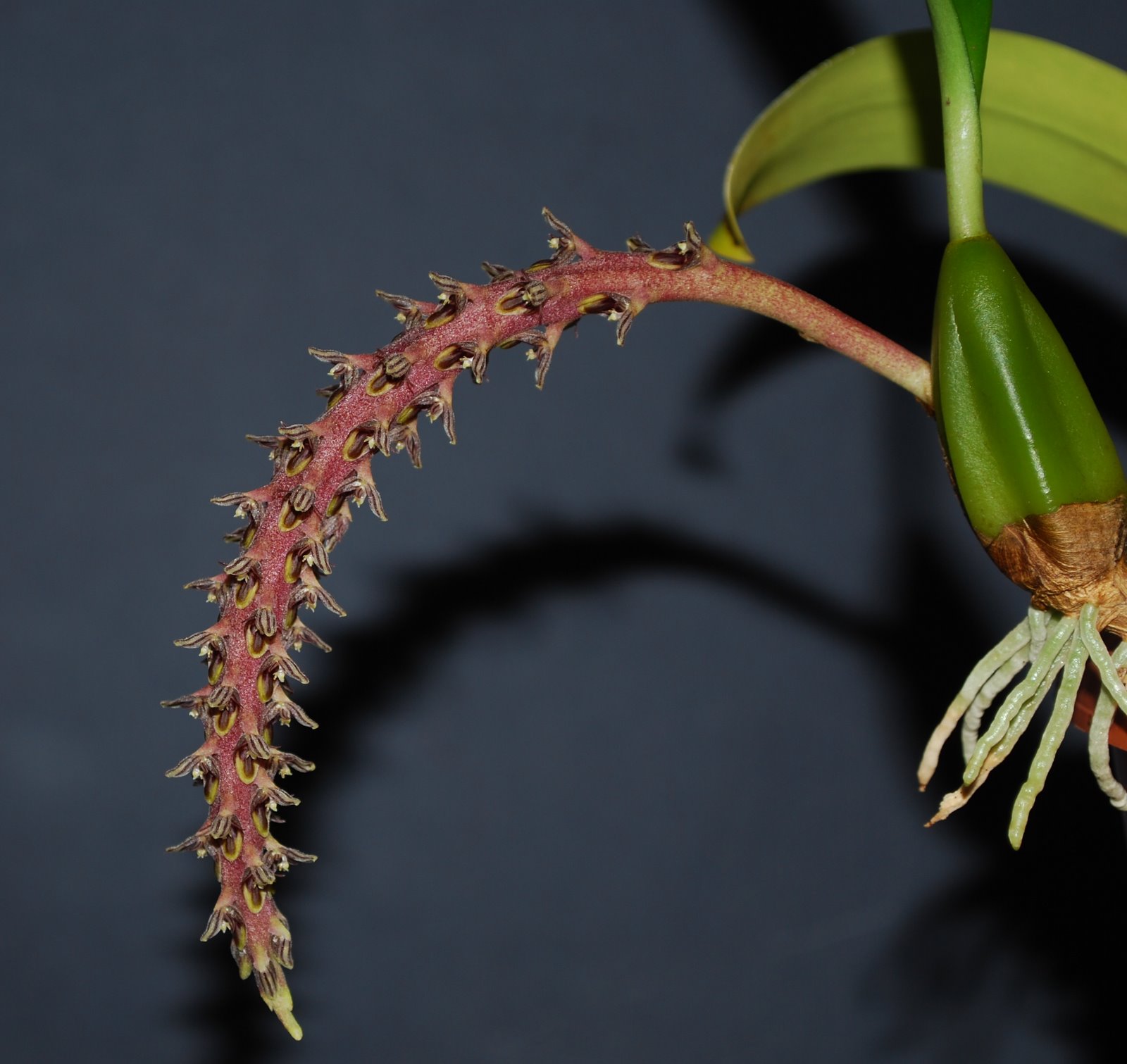 Found in Sulawesi in forests at elevations of sealevel to 1200 meters as a miniature sized, hot to warm growing epiphyte with 2 to 4" [5 to 10 cm] between each, distinct, ovoid pseudobulb and carrying a single, apical, erect, elliptic to elliptic-ovate, acute, gradually narrowing below into the .28 to 1" [.7 to 2.5 cm] long, petiolate base leaf that blooms on an arching, rather dense, racmose, thickened, densely papillose-hirsute, 4.4 to 8" [11 to 20 cm] long, 35 to 45 flowered inflorescence with 4 bracts and acute floral bracts.