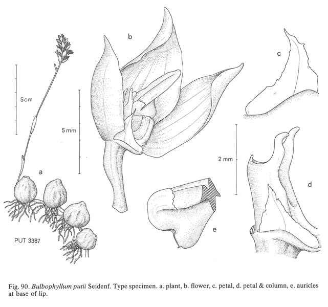 References W3 Tropicos, Kew Monocot list , IPNI ; The Orchids of Thailand Seidenfaden & Smitinand 1959 as B sp #80 PUT 3387A pg 422; *Dansk Botanisk Arkiv Bind 33 #3 Orchid Genera in Thailand VIII Bulbophyllum Thou Seidenfaden 1979 drawing fide;