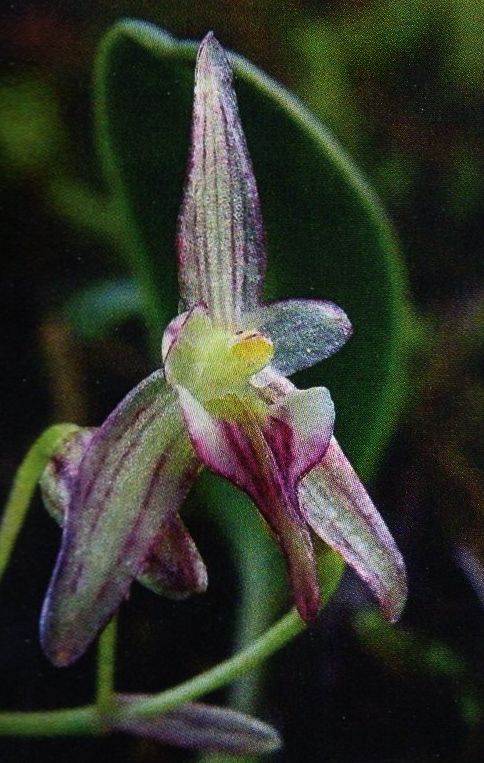 Found in Yunnan province of ChinaNepal and Bhutan on mossy mid-sized tree trunks and main branches, growing in partial shade on trees on the edges and in openings of Quercus forest at elevations around 2400 meters as a mini-miniature sized, cold growing, mat forming epiphyte with a creeping, stout, dark brown rhizome with .4 to 1.6" [1 to 4 cm] between each obliquely ovoid-conical, greenish, lower half enclosed by a transparent, net-veined sheath pseudobulb carrying a single, apical, ligulate-lanceolate, sub-acute, obscurely bilobed, leathery leaf that blooms in the later spring on a pendulous, lateral from the pseudobulb base, peduncle slender, with 3 overlapping, brown, membraneous, tubular sheaths, 1.4 to 2" [3.5 to 5 cm] long, 1 to 3 flowered inflorescence with lanceoalte, acute, concave, brownish, tinged purple-brown floral bracts.