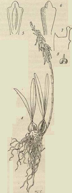 Found in Madagascar in montane erinaceous scrub and lichen rich forests at elevations of 2000 to 2400 meters as a small sized, cold growing epiphyte with .4” [1 cm] between each, widely ovoid to subspherical, 3 to 4 angled pseudobulbs carrying 2, apical, narrowly oblong, shortly attenuate base leaves that blooms in the late summer and fall on a basal, erect, peduncle 5.2” [13 cm] long, enveloped almost completely by 6 to 7, obtuse, elongated, obtuse, adpressed sheaths, 8 to 14.8" [20 to 37 cm] long, rachis cylindrical, not thicker than the apex of the peduncle, slightly verrucose, 10 to 20 flowered inflorescence with persistent, reflexed, narrowly lanceolate, thin, scarious, 3 veined, shorter nthan the pedicel floral bracts and carrying compressed, somewhat drooping flowers.