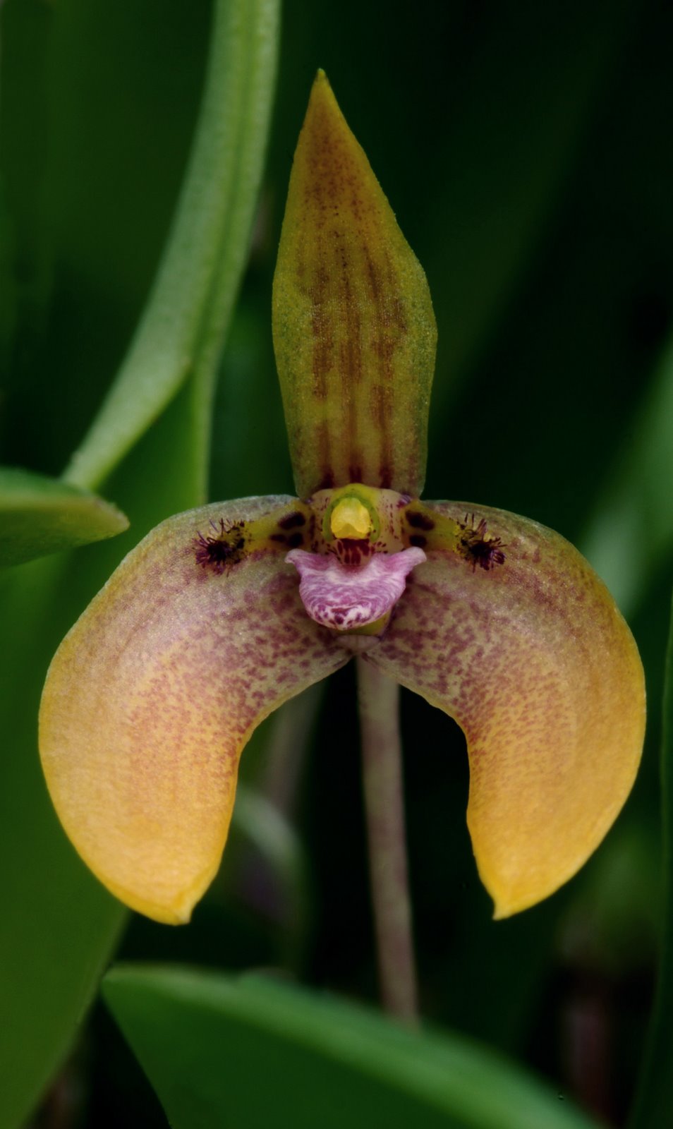 Found in New Guinea on trees in montane forests at elevations around 450 meters as a miniature to small sized, hot growing epiphyte with narrowly cylindrical pseudobulbs carrying a single, apical, erect, coriaceous, narrowly ligulate, minutely apiculate, narrowing below into the petiolate base leaf that blooms in the spring on a basal, short, single flowered inflorescence