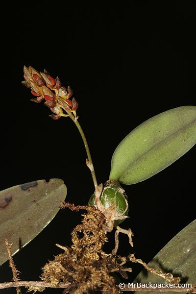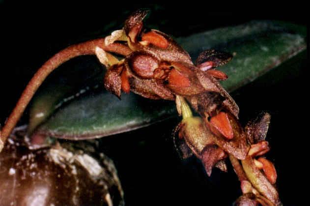 Found in Thailand, Myanmar and India? at elevations of 500 to 600 meters as a mini-miniature sized, warm growing unifoliate epiphyte with a creeping, branching rhizome with up to 2" [5 cm] between each four sided, broadly ovoid to conical, ribbed pseudobulb carrying a single, apical, leathery, somewhat flexible, elliptic to oblong, violet beneath, shortly petiolate base leaf that blooms in the fall on a descending to pendent, somewhat slender, 3.2" [8 cm] long, 10 to 12 flowered inflorescence carrying, simultaneously opening, resupinate flowers.