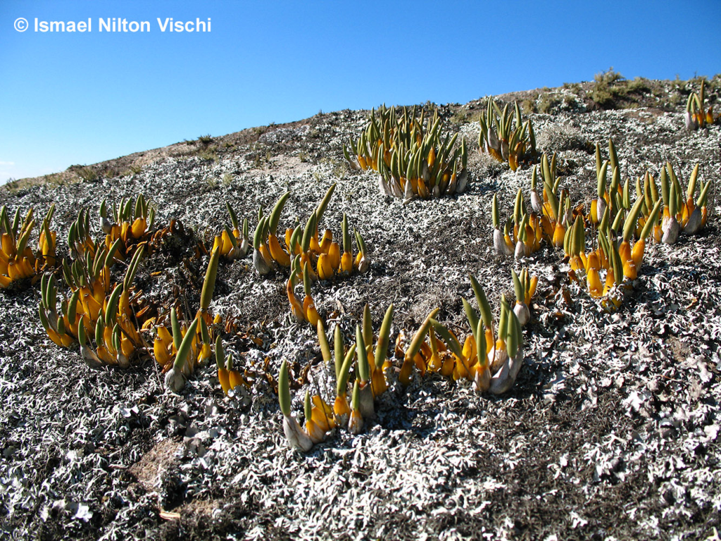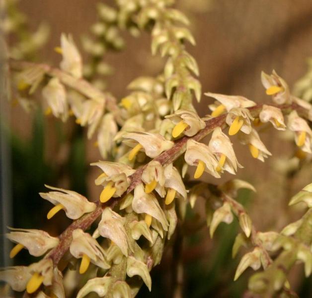 Found in Goias, Serra do Caldas, Minas Gerais and Sao Paulo states of Brazil as a mini-miniature sized, warm to cool growing lithophyte on exposed rocks and rarely as an epiphyte on mossy branches with a creeping, branching rhizome giving rise to close set, ovoid to globose, subtetragonal, shiny pseudobulbs carrying a single, erect, leathery, rigid, narrowly elliptic, semi-terete, deeply sulcate, acute, shortly petiolate base leaf that blooms in the spring on an upright, arching to descending, laterally from the base, to 6.4" [to 16 cm] long, many flowered inflorescence carrying simultaneously opening, resupinate flowers.