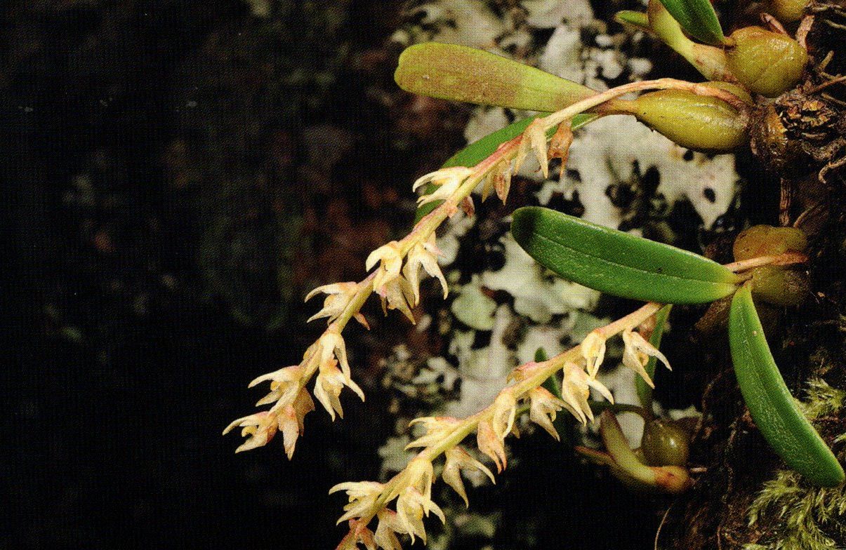 Found in northern and central Madagascar in lichen rich evergreen forests at elevations around 1300 to 2500 meters as a mini-miniature sized, cool to cold growing epiphyte with .4 to .6" [1 to 1.5 cm] between each ovoid pseudobulbs carrying a single, apical, oblong-ligulate, shortly contracted basally leaf that blooms in the spring, summer and earlier fallon a basal, erect, peduncle .4 to 1" [1 to 2.5 cm] long, longer than the leaf, rachis clear yellow, 2.4 to 3.6" [6 to 9 cm] long overall, densely many flowered inflorescence with oval-acuminate, half as long as the flower floral bracts.