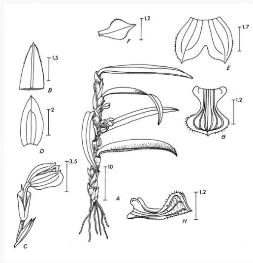 Found in New Guinea on open ridges at elevations of 2145 to 3100 meters as a mini-miniature sized, cold growing epiphyte with a shrub-like rhizome wnveloped by large, tubular, overlapping, acutely acuminate, keeled sheaths and giving rise to secund, two ranked, terete, adpressed to the rhizome,, adpressed side concave, truncate pseudobulbs carrying a single, apical, slightly recurved, narrowly lanceolate, acute, fleshy, c. 3-3.7 by 0.6-0.8 cm; base narrowed and conduplicate, obtusely angled; median channelled with the sides slightly convex; underneath convex; top part underneath minutely impressed punctate leaf that blooms in the spring on many, fascicled, peduncle .14" [.35 cm] long, entirely covered with small, clasping, membranous sheaths, single flowered inflorescence with the bract at the base tubular, obliquely infundibuliform-widened, acute-acuminate, keeled, membranous floral bracts