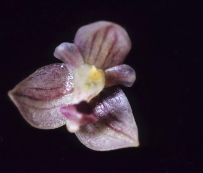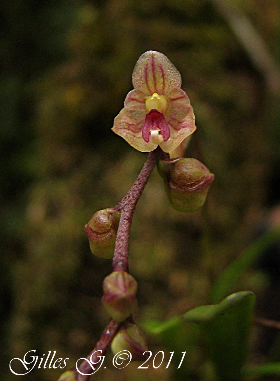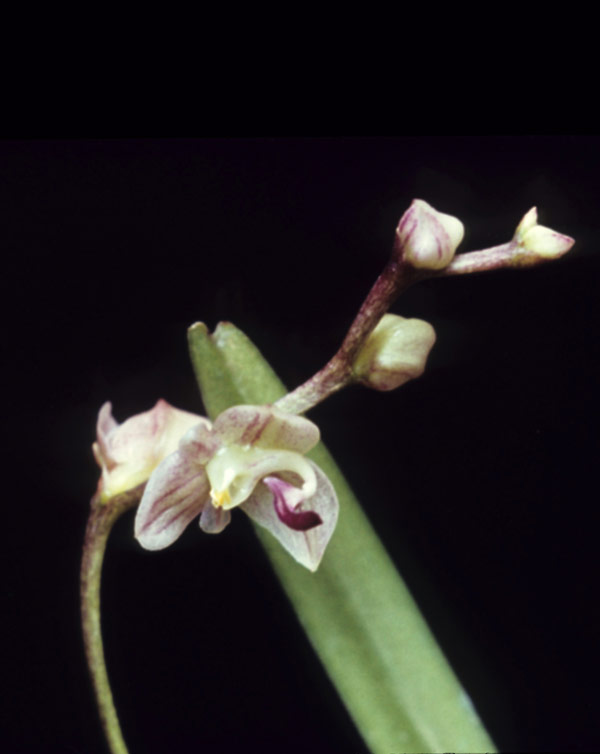 Found in east northeastern Madagascar in humid, mossy evergreen forests at elevations around 900 to 1200 meters as a small sized, warm to cool growing epiphyte with conical pseudobulbs enveloped by fibers and carrying 2 apical, suberect, ligulate-oblanceolate leaves that blooms in the summer on a basal, erect, 4 to 7.2" [10 to 18+ cm] long overall, 5 to 13 flowered inflorescence.