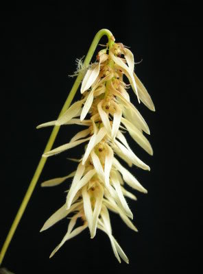 Found in Yunnan province of China, Thailand and Vietnam at elevations around 1350 to 1700 meters as a miniature sized, cool growing epiphyte with close set, pseudobulbs carrying 2 to 3, apical leavesthat blooms in the spring on a pendent, close, rachis to 2.4” [6 cm] long, sharply defexed, 6.8” [17 cm] long, many flowered inflorescence with hairy margined sepals