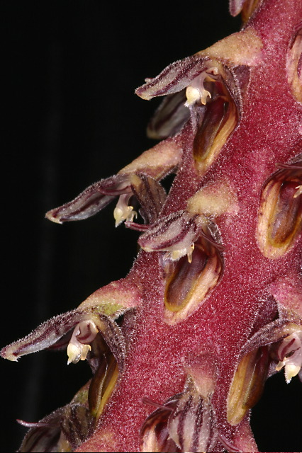Found in the Philippine at elevations around 1000 meters as a small sized, warm growing epiphyte with .8" [2 cm] between each, 4 to 5 angled, ovoid pseduobulb enveloped by 2 brown, membraneous sheaths and carrying a single, apical, linear leaf that blooms in the spring on a basal, stout, erect to arcuate, 2 to 3.4" [5 to 8.5 cm] long, pubescent, dull red inflorescence with many [40] succesively opening, odorless flowers that barely appear out of the swollen rachis, arranged in a helix.
