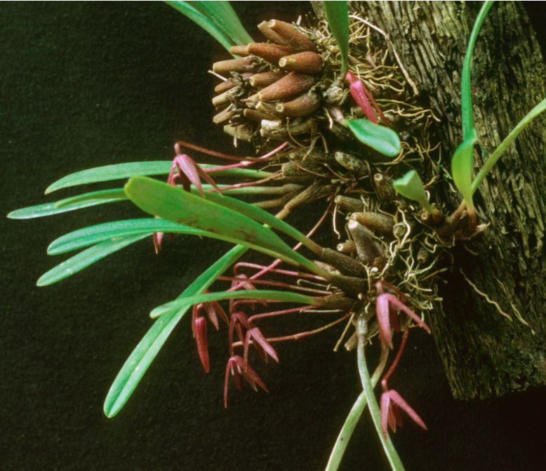 Found in Papua New Guinea at elevations around 2400 meters as a mini-miniature sized, cold growing epiphyte with a creeping rhizome with .04 to .36" [1 to 9 mm] between each distinct, ellipsoid to ovoid, harldly angular pseudobulb carrying a single, apical, erect, obovate, obtuse apically, petiolate base leaf that blooms in the summer and fall on a single or several together, peduncle .72 to 1.32" [1.8 to 3.3 cm] long, provided with 2 scales, basal, 2 to 3.2" [5 to 8 cm] long overall, single flowered inflorescence with shorter than the ovary floral bracts and carrying flowers with purple sepals with darker veins and the petals and lip are dark purple, with white hairy patches.