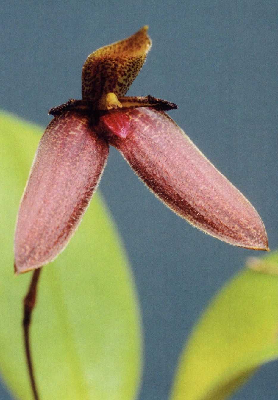Found in Papua New Guinea in disturbed rainforests at elevations around 900 meters as a mini-miniature sized, warm growing epiphyte with .16" [4 mm] between each closely, distinct, obliquely erect, ovoid-conical, somewhat narrowing apically pseudobulb with many longitudinal grooves carrying a single, apical, erect, elliptic, acute, petiolate base leaf that blooms on a single to a fascile of a few, basal, peduncle 1.52 to 2.2" [3.8 to 5.5 cm] long, provided with 2 bracts, 3.2 to 4" [8 to 10 cm] long overall, single flowered inflorescence with much shorter than the the ovary floral bracts.
