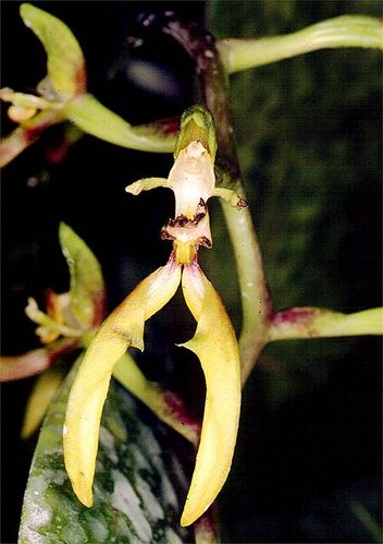 Found in Papua New Guinea at unknown elevations and vegetative parts not seen that blooms on an erect to patent peduncle, an arching, [16 cm] long rachis, rather lax, to 10 flowered inflorescence with ovate, the lowermost tubular, acute floral bracts and carrying mostly simultaneously opening flowers.