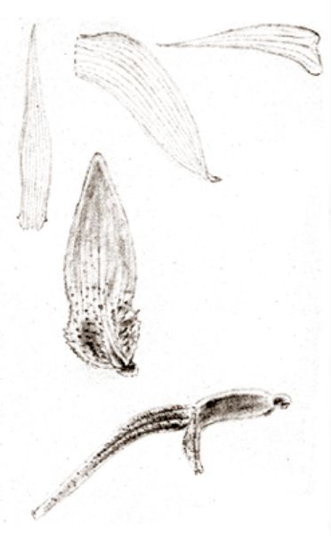 Found in western New Guinea in lower montane forests at elevations around 1100 meters as a small sized, cool growing epiphyte with a creeping rhizome covered with tubular, dark brown-punctate sheaths giving rise to making an acute angle with the rhizome, with .64 to .78" [1.6 to 1.7 cm] between each elongate-conical, longitudinally rugose pseudobulbs carrying a single, apical, erect, sublanceolate-linear, subcoriaceous, rather rigid, apex gradually narrowed, acute, midrib above grooved, below keeled, margins in dried leaf revolute, on both sides densely minutely punctuate, gradually narrowing and conduplicate below into the petiolate base leaf that blooms in the late winter and early spring on a basal, much shorter than the leaves, filiform, c. 4.8" [12 cm] long, provided with c. 4, upwards laxly placed tubular sheaths, rachis thickened, flexuose, .36" [.9 cm] long, producing at intervals, successively single, up to 6 flowered. inflorescence with alternating, distichous, erect-patent, concave, acuminate, punctate, base obliquely infundibuliform floral bracts.