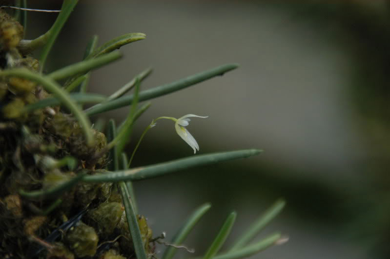 Found in Vietnam in open forests at elevations around 2000 meters as a mini-miniature sized, cool to cold growing epiphyte with .8" [2 cm] between each globose pseudobulb enveloped by fibrous sheaths and carrying a single, apical, erect, semiterete, acute leaf that blooms on a 2" [5 cm] long, 1 to 3 flowered inflorescence carrying whitish flowers.