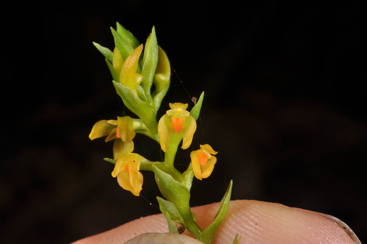 Found in Bukidinon and Leyte the Philippines in forests at elevations around 500 to 750 meters as a mini-miniature sized, warm growing epiphyte with crowded to .8" [2 cm] between each, small, cylindric pseudobulbs carrying a single, apical, erect, leathery, narrowly oblong-lanceolate, grooved, 2" [5 cm] long, petiolate base leaf that blooms in the late winter and early spring on an erect, slender, rachis to 6" [15 cm] long, to 12" [30 cm] long overall, successively few, many flowered inflorescence with triangular-lanceolate, rigid floral bracts carrying flesh colored flowers