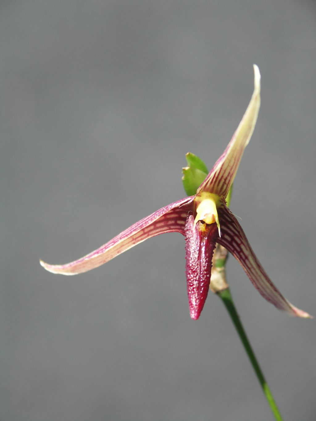 Found in Papua and New Guinea in rainforests near ridgetops or overhanging water on branches and in forks on humus at elevations of 150 to 900 meters as a large sized, unifoliate, hot growing, epiphytic species from with .4" to .6" [1 to 1.5 cm] between each cylindrical, tapering pseudobulb carrying a single, apical, suberect to decurved, lanceolate to obovate, stiff, leathery, gradually narrowing below into the semiterete petiolate base leaf that blooms in the late fall and winter on a basal, thin, erect, 28" [70 cm] long, drooping, fractiflex, successively single, to 30 flowered inflorescence with individually short-lived flowers lasting over several months.