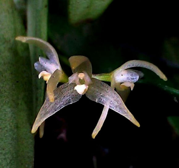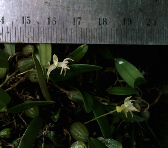 Found in western Sumatra at unknown elevations as a mini-miniature sized, warm to cool growing epiphyte with a long, thin rhizome with .32 to .68" [.8 to 1.7 cm] between each, ovoid, obtuse, 5 longitudinal channeled pseudobulb carrying a single apical, erect, narroiwly oblong, not narrowing apically, obtuse, very shortly narrowed below into the base leaf that blooms on a basal, peduncle thin, to .84 to .96" [2.1 to 2.4 cm] long, rachis very short, 2 to 3 flowered inflorescence.