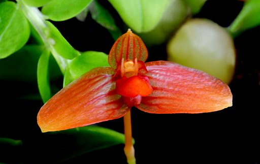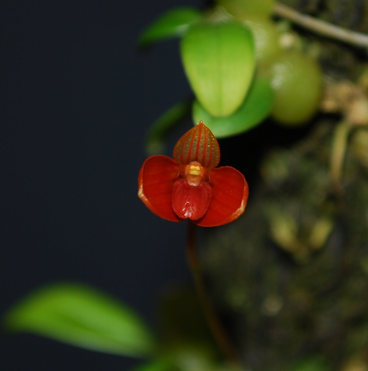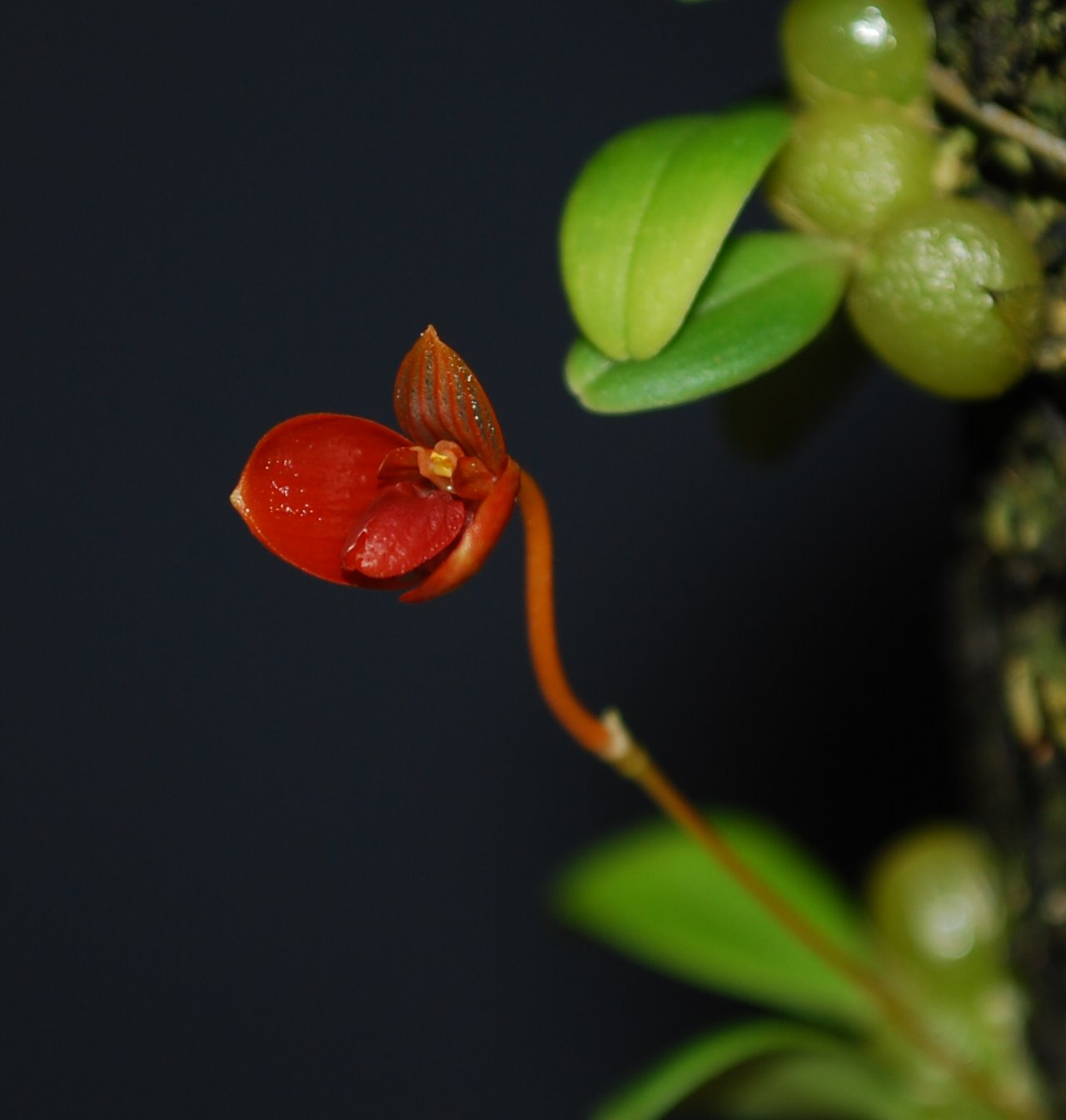Found in Borneo at elevations around 1300 to 1500 meters as a mini-miniature sized, cool growing epiphyte with a creeping rhizome giving rise to ovoid, ellipsoid to orbicular, slightly flattened pseudobulbs carrying a single, apical, erect, rigid, elliptic, obtuse, gradually narrowing below into the petiolate base leaf that blooms in the spring on a basal, erect, 1.8 to 2" [1.3 to 5 cm] long, single flowered inflorescence with tubular floral bracts and carrying non fragrant flowers