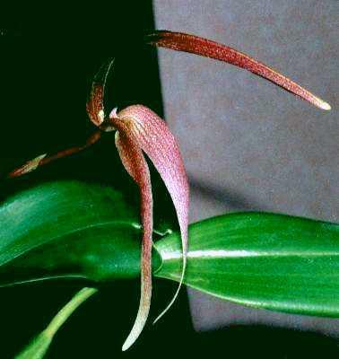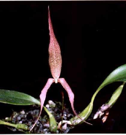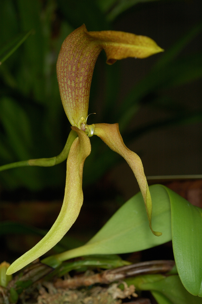 Found in Papua New Guinea on trees in lowland montane forests at elevations around 300 meters as a small sized, hot to warm growing, unifoliate epiphyte with 1.2" [3 cm] between each narrowly conical, 4 angled pseudobulb carrying a single, apical, erect, obovate-oblong, narrowly subpetiolate basally, glabrous, fleshy leaf that blooms in the spring on a basal, stout, erect, provided with a few tightly clasping, distant peduncle-scales, 6 to 8" [15 to 20 cm] tall, single flowered inflorescence with cucullate, apiculate, much shorter than the ovary floral bracts .