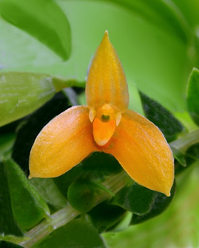 Found in penninsular Malaysia, Sumatra, Borneo and Sulawesi in the understory of mossy montane forests on twigs at elevations of 1000 to 1400 meters as a mini-miniature sized, warm growing epiphyte with distinct, erect, ovoid, finely grooved pseudobulbs carrying a single, apical, erect, coriaceous, elliptic to ovate, acute to acuminate, gradually narrowing below into the shortly petiolate base leaf that blooms on a basal, 1.6 to 2.6” [4 to 6.5 cm] long, single flowered inflorescence with acute floral bracts.