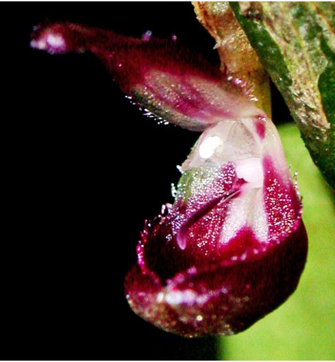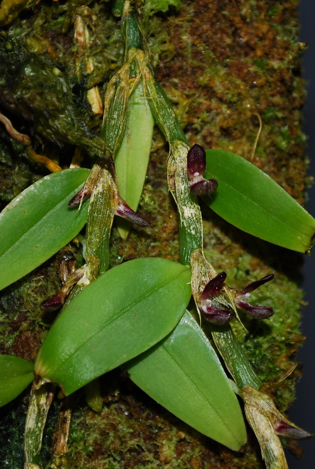 Found in Irian Jaya New Guinea in montane riverine forest at elevations of 1900 to 2100 meters as a small sized, cool growing epiphyte with a creeping, pendulous rhizome giving rise to porrect, distant, cylindrical or slightly obovoid, the new shoot arising from the top of the pseudobulb carrying a single, apical, erect, ovate, acute-acuminate, sessile leaf that blooms in the late spring on a .28" [.7 cm] long overall, peduncle 0.3 cm long, provided with 2 porrect, non-floriferous bracts, the longest ca .14" [3.5 mm] long, single flowered inflorescence and a tubular, acute, longer than the ovary floral bract