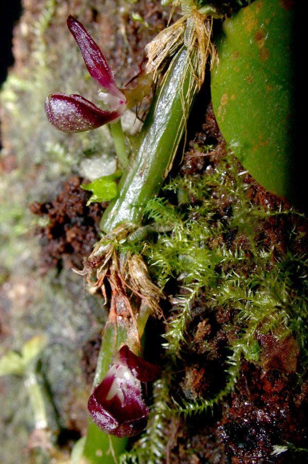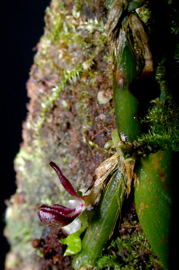 Found in New Guinea and Solomon Islands in primary forests at elevations around 1300 meters as a mini-miniature sized, warm growing epiphyte with an elongate rhizome giving rise to superposed, cylindrical pseduobulbs carrying a single, apical, erect-patent, lanceolate, acute, attenuate base leaf that blooms in the late spring on very short, basal single flowered inflorescence with apiculate, as long as the ovary floral bracts.