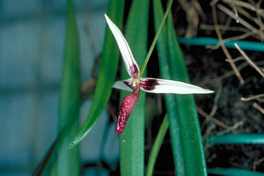 Found in Papua New Guinea, Solomon Islands, Horn Islands and Vanuatu in hill country on trunks of large trees at elevations of 800 to 900 meters as a miniature to small sized, hot to warm growing epiphyte with a subcylindric to narrowly ovoid and conical, attenuate, green to yellow green, ventrally deeply channeled pseudobulb that is partially enveloped basally by a sheath when young, and carrying a single apical, erect, short and semi-terete petiole, linear, keeled, acute leaf, that has a basal, slender, 1 1/2 to 1 3/4" [40 to 45 mm] long, single flowered inflorescence that holds the delicate, diurnal flower at mid-leaf.