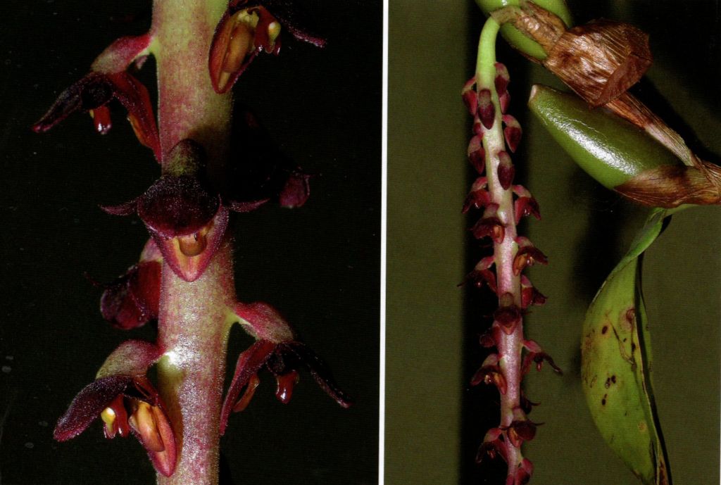 Found in Sulawesi in primary forests at elevations around 1000 meters as a small sized, warm to cool growing epiphyte with a patent to pendulous, branching rhizome with 1.2 to 2.32" [3 to 5.8 cm] between each conspicuous, ovoid, hardly angular pseudobulb carrying a single, elliptic to ovate, acuminate, petiolate base leaf that blooms on a basal, peduncle 1" [2.5 cm] long, provided with 2 bracts, rachis nodding, thickened, to 3.6" [9 cm] long, finely papillose-hirsute, rather dense, to 25 flowered inflorescence with acuminate, longer than the ovary floral bract.