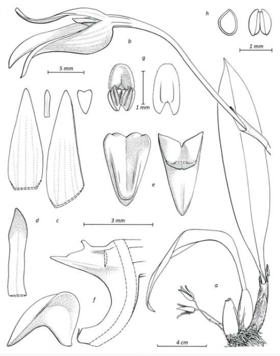 Found in Papua New Guinea in lowland primary forests at elevations around 150 meters as a miniature to small sized, hot growing epiphyte with a very short rhizome giving rise to narrowly ovoid or cylindrical-ovoid pseudobulbs carrying a single, apical, erect or suberect, oblanceolate-ligulate, acute or subacuminate, subcoriaceous, glabrous, base gradually narrowed, petiolate-like base leaf that blooms in the winter on a short, hardly .4" [1 cm] long, peduncle short, provided with few peduncle scales, single flowered inflorescence with cucullate, apiculate, much shorter than the pedicellate ovary floral bracts.