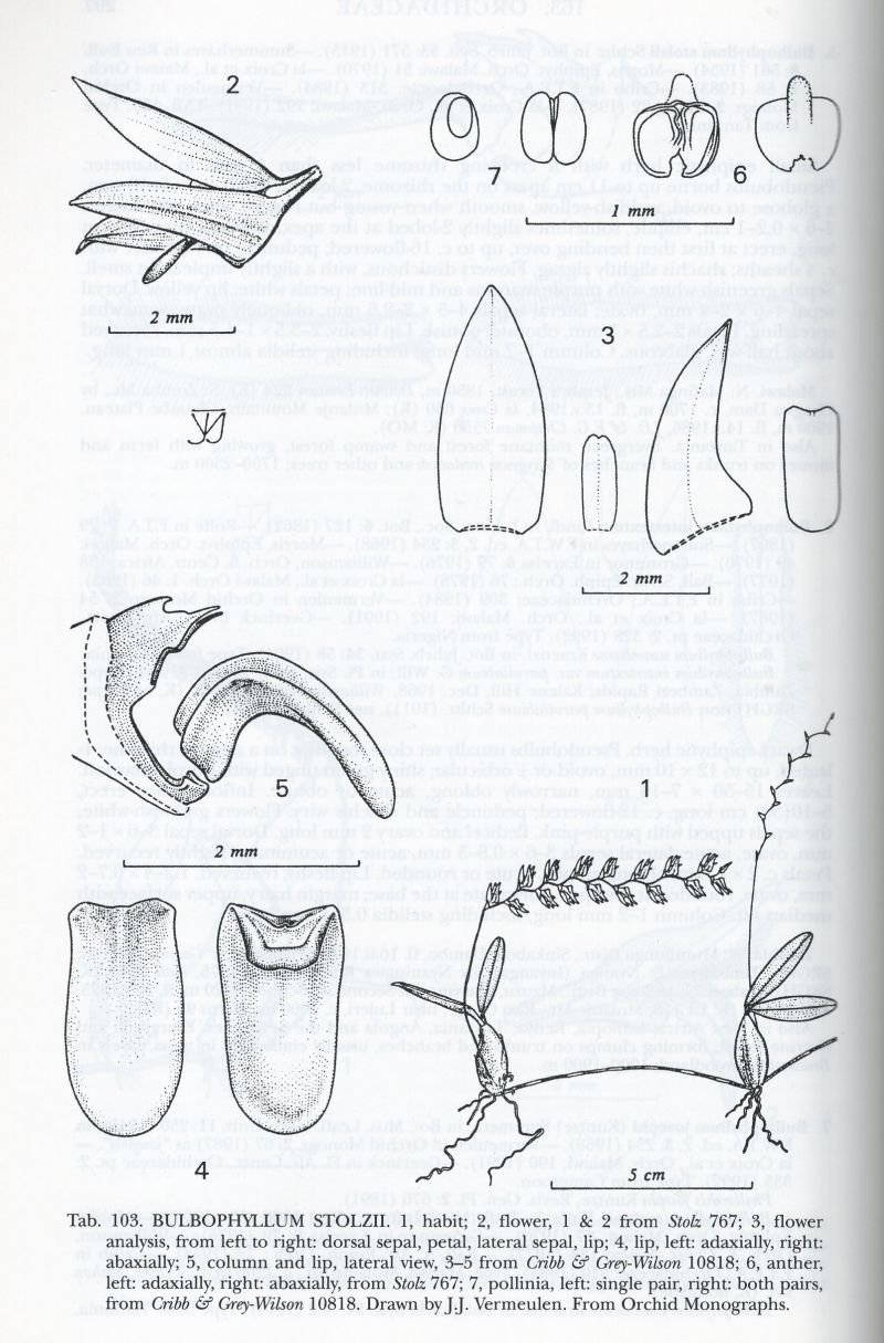 References W3 Tropicos, Kew Monocot list , IPNI ; The Epiphytic Orchids of Malawi Morris 1970; Malawi Orchids Vol 1 La Croix 1983 drawing fide; Flora of Tropical East Africa Orchidaceae Vol 2 Cribb 1984; Orchid Monographs Vol 2 - A Taxonomic Revision of the Continental African Bulbophyllinae Vermeullen 1987 drawing fide; Flora Zambesiaca Vol 11 Orchidaceae Part 1 Pope 1995 drawing fide; African Orchids in the Wild and Cultivation La Croix 1997 drawing good; Bulbophyllum and Their Allies Seigerist 2001 photo fide;