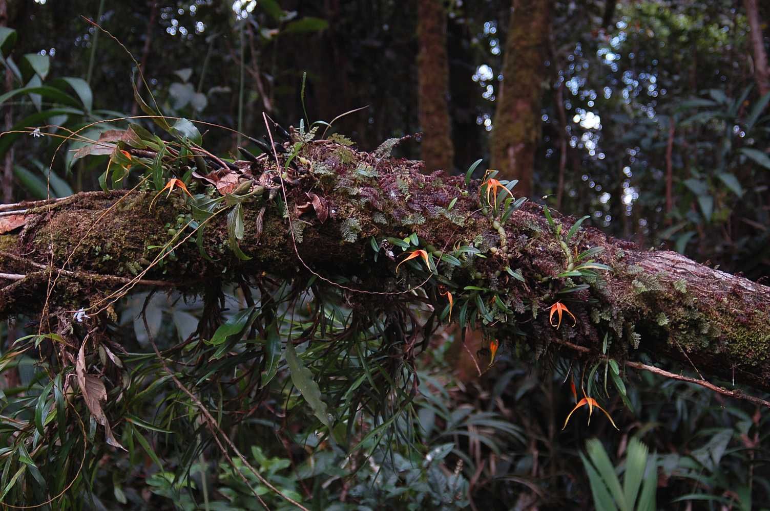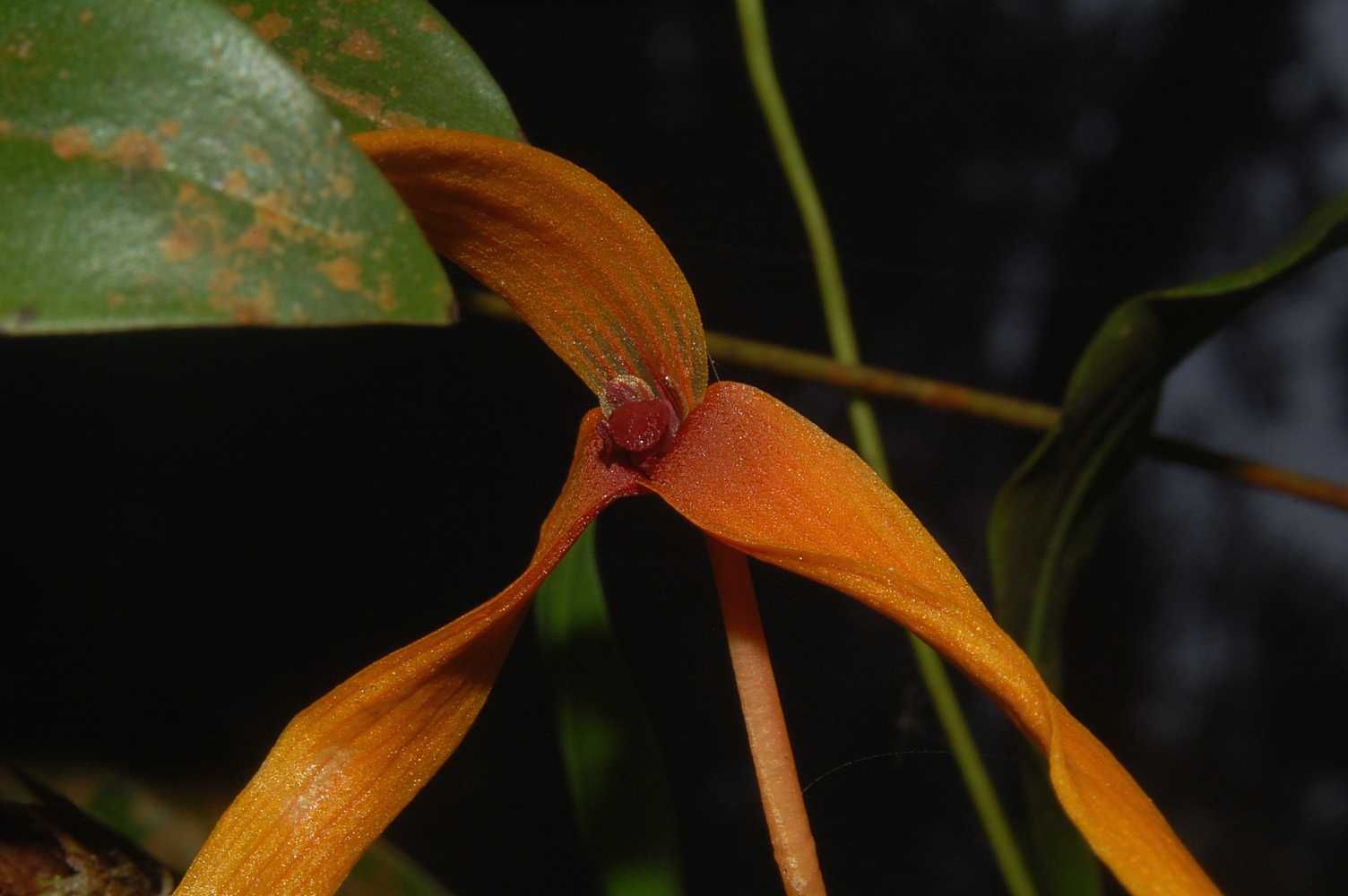 Found in Malaysia, Sumatra and Borneo at altitudes of 1000 to 2000 meters in wet or dry, dense or open montane forests on bare or mossy branches on understory trees or shrubs as a miniature sized, unifloliate, epiphyte with an oblong, somewhat flattened pseudobulb that is oblique with an upturned tip, adpressed and close-set to the rhizome carrying a single, apical, elliptic, petiolate leaf which blooms in the summer and early fall on a slender, 2 3/8" to 3 3/4" [6 to 9 cm] long, erect inflorescence that has a solitary unscented flower held well above the leaves.