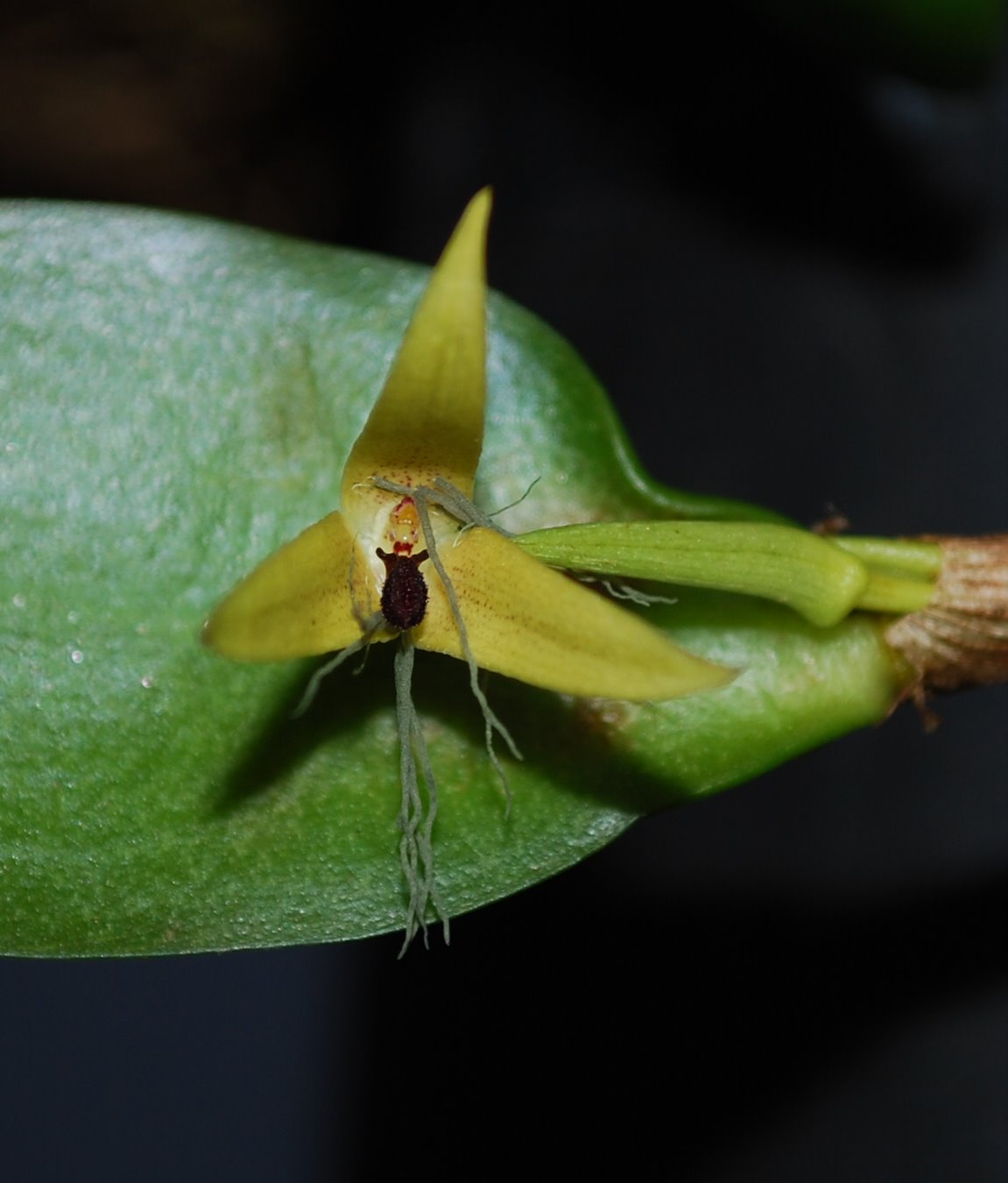 Found only in Sabah Borneo in high montane forests at elevations around 1300 meters as a miniature sized, warm to cool, pendant growing epiphyte with .6" [1.5 cm] between each ovoid to ellipsoid, hardly flattened pseudobulb carrying a single, apical, erect, thick, ovate to elliptic, yellowish-green, abruptly narrowing below into the petiolate base leaf that blooms in the fall on a .8" [2 cm] long, single flowered inflorescence with a tubular floral bract.