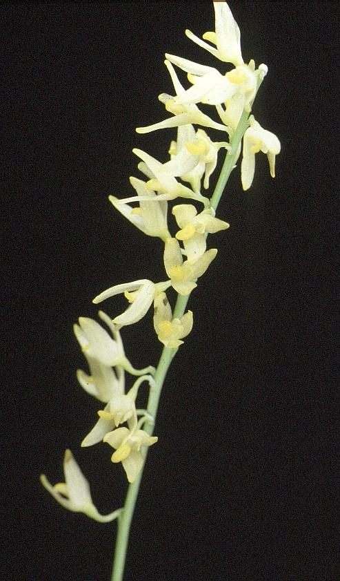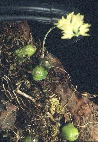 Found in southern Yunnan province of China, Thailand and Myanmar in evergreen broadleaved forests as a mini-miniature sized, warm to cool growing epiphyte at elevations of 900 to 1700 meters with ovoid-oblong, lumpy pseudobulbs carrying 2, apical, deciduous, thin, narrowly oblanceolate leaf and blooming in the winter on a 10" [25 cm] long, decurved, sheathed inflorescence with pendant, fragrant musky scented flowers.
