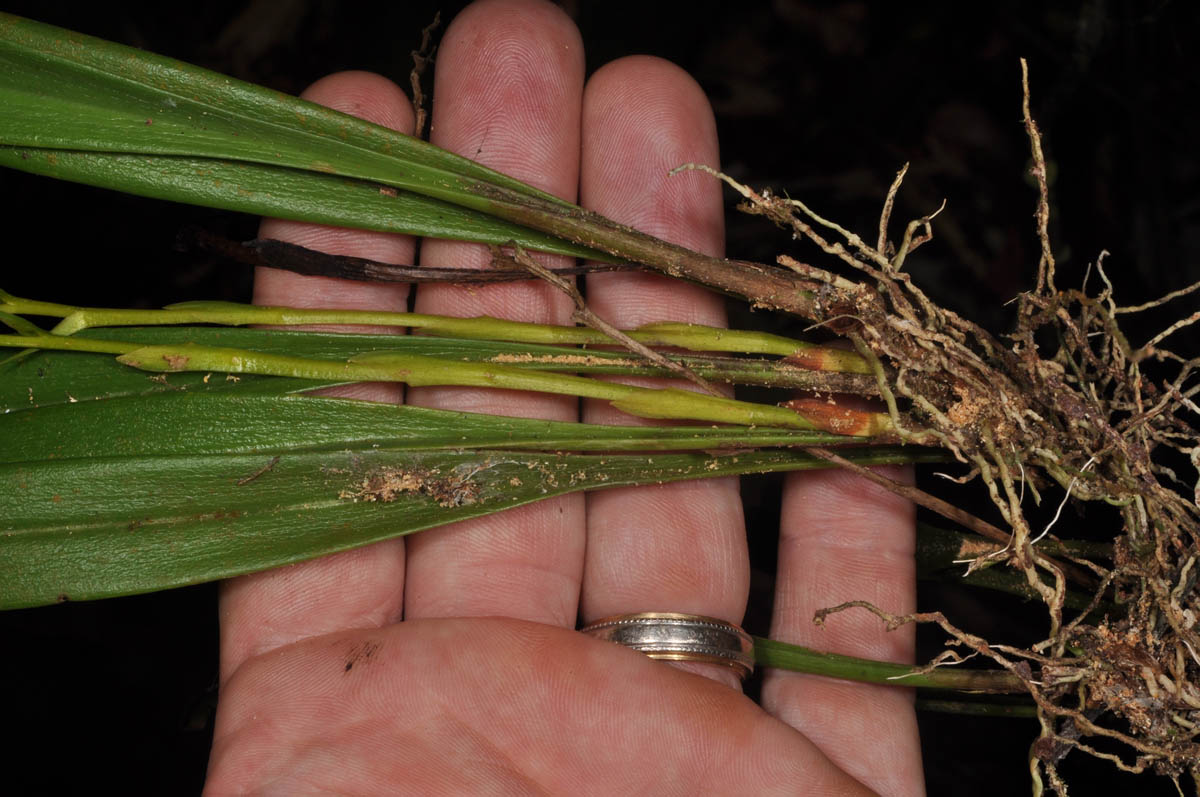 Found in Rizal the Philippines at elevations around 300 meters as a mini-miniature sized, hot growing epiphyte with shortly cylindric pseudobulbs carrying a single, apical, erect, very leathery, narrowly elliptic-oblong, slender, 1.2 to 2" [3 to 5 cm] long petiolate base leaf that blooms in the later summer on an erect, basal, slender, rachis to 1.6 to 2.4" [4 to 6 cm] long, to 4.8" [12 cm] long overall, to 10 flowered inflorescence with triangular-lanceolate, spreading floral bracts carrying whitish tinged with yellow colored flowers
