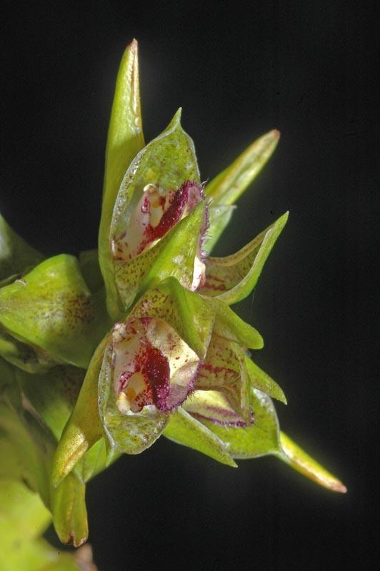 Found in northeastern Madagascar in humid evergreen forests at elevations of 800 to 1700 meters as a small to just medium sized, warm to cool growing epiphyte with a sheath enveloped rhizome carrying close-set, ovoid, 4 angled pseudobulbs carrying 2, apical, lanceolate, acute, subpetiolate and attenuate towards the base leaves that blooms in the late spring and summer on a 8" [20 cm] long, very thick, yellowish green, incurved inflorescence that is enveloped by 5 to 7 sheaths.