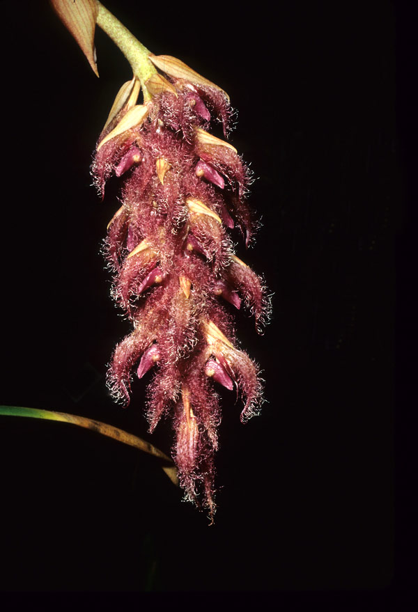 Found in Brunei Borneo in peat swamp lowland forests at elevations around 10 meters as a medium sized, hot growing epiphyte with [7 to 14 cm] between each distinct, ellipsoid to almost cylindrical, flattened pseudobulb carrying a single, apical, erect, elliptic to obovate to ovate, acute to acuminate, petiolate base leaf that blooms in the spring on an erect to patent, elongate, peduncle [32 to 42 cm] long, rachis, somewhat nodding, to 3.2 to 3.6" [8 to 9 cm] long, densely 15 to 18 flowered inflorescence with ovate, acute floral bracts and carrying simultaneously opening, rotting fish scented flowers.
