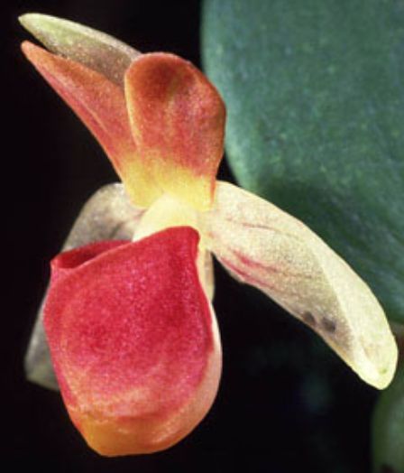 Found in the Bismarck Archipelago as a mini-miniature sized, erect to suberect epiphyte with a creeping rhizome concealed by sheaths and giving rise to obovoid, smooth smooth, yellow green pseudobulbs carrying a single, apical, erect, elliptic to lanceolate, apically obtuse; base surfaces glossy green, firm, rib sunken above, duplicative below into the sessile base leaf that blooms on a more or less fascicled, lateral from the base of the pseudobulb, erect, peduncle short, .128 to .158" [3.1 to 3.8 mm] long, provided with a single glabrous sheath, single flowered inflorescence.