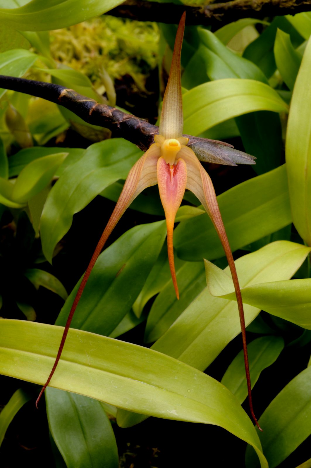 Found in Borneo at elevations of sealevel to 1600 meters as a medium sized, hot to cool growing epiphyte with 1.2 to 3.2" [3 to 8 cm] between each small compared to the palnt, ovoid-cylindrical to ellipsoid-cylindrical, not angular pseudobulbs carrying a single, apical, erect, elliptic to ovate, obtuse to acute, petiolate base leaf that blooms in the spring on a patent, congested, peduncle 23 to 13.8" [30 to 34.5cm] long, rachis porrect, slightly thickened, to 5.8" [14.5 cm] long, to 19.6" [to 45 cm] long overall, densely to 35 flowered inflorescence with slightly conduplicate floral bracts.