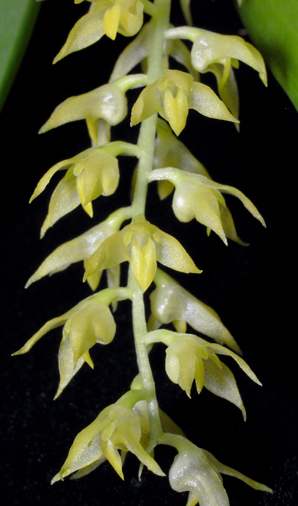 Found in Sulawesi in mossy riverine and dry forests on very steep slopes at elevations of 500 to 2500 meters as a small sized, warm to cold growing epiphyte with rather stiff, patent to pendulous, sparsely to frequently branching rhizomes with 1.2 to 4.4" [3 to 11 cm] between each cylindrical pseudobulb carrying a single, apical, erect, coriaceous, ovate to elliptic or terete to laterally flattened, gradually narrowing below into the .16 to 1.6" [.4 to 4 cm] long, petiolate base leaf that blooms in the winter on a porrect, 1.36 to 5.2" [3.4 to 13 cm] long, 8 to 50 flowered inflorescence with acute floral bracts and carrying sometimes fragrant flowers