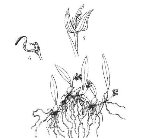Found in southwestern Yunnan province of China in forests on tree trunks at elevations around 2000 meters as a mini-miniature sized, cool to cold growing epiphyte with close set, subovoid, pseudobulbs carrying a single, apical, sessile, oblong, subleathery, scabrous apical margins, acute leaf that blooms in the early summer on 2 to 3, basal, .55" [1.3 cm] long, umbel-like, often 4 to 5 flowered with 2 to 3 tubular sheaths and ovate-lanceolate, acute floral bracts and carrying non-resupinate, yellowish with a red lip and red apical parts of the sepals.