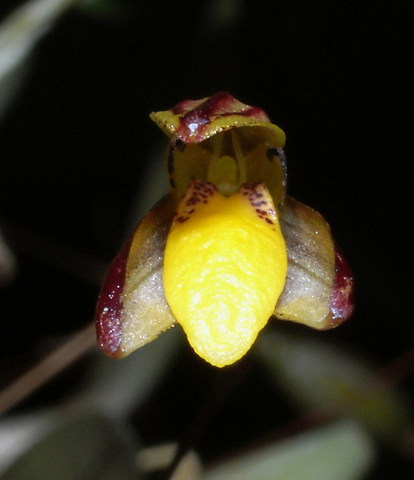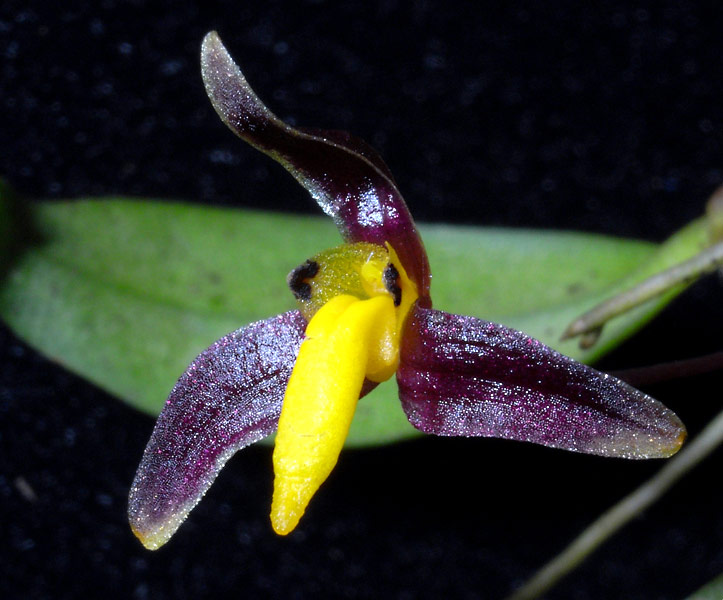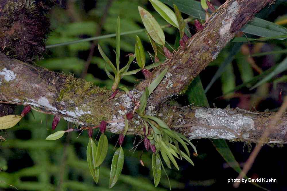 Found in the Andaman Islands, Thailand, Laos, Cambodia, Malaysia, Sumatra, Borneo, Java, Lesser Sunda Islands, Sulawesi and the Philippines on old mangroves and isolated trees in grasslands, podosol forests and lower montane forests at elevations around sea level to 1530 meters as a miniature sized, hot to cool growing epiphyte with ovoid, slightly 4 angled, purple flushed pseudobulbs that are close set and carries a single, apical, linear, more or less acute, thick, fleshy, basally slightly petiolate leaf that has the base flushed with purple and blooms in the summer on a .8 to 2.2" 2 to 5.2 cm] long, slender, single flowered inflorescence.
