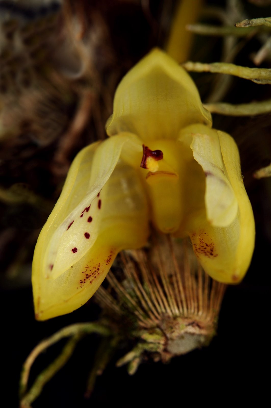 Found in Malesia without locational data as a small sized epiphyte with 2.8 to 4.4" [7 to 11 cm] between each ovoid pseudobulb and carrying a single, apical, erect, obovate, rounded, gradually narrowing below into the petiolate base leaf that blooms on a basal, 2 to 2.4" [5 to 6 cm] long, single flowered inflorescence with a tubular, acute floral bract.