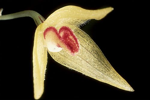 Found in New Guinea on trees in primary forests at elevations of 1800 to 3000 meters as a mini-miniature sized, cool to cold growing epiphyte with a patent rhizome giving rise to clustered, ovoid pseudobulbs carrying a single, apical, erect, ovate to elliptic, acute, narrowing below into the petiolate base leaf that blooms in the spring and early summer on a [4.5 to 7 cm] long, single flowered inflorescence with tubular, acute. shorter than the ovary floral bracts.