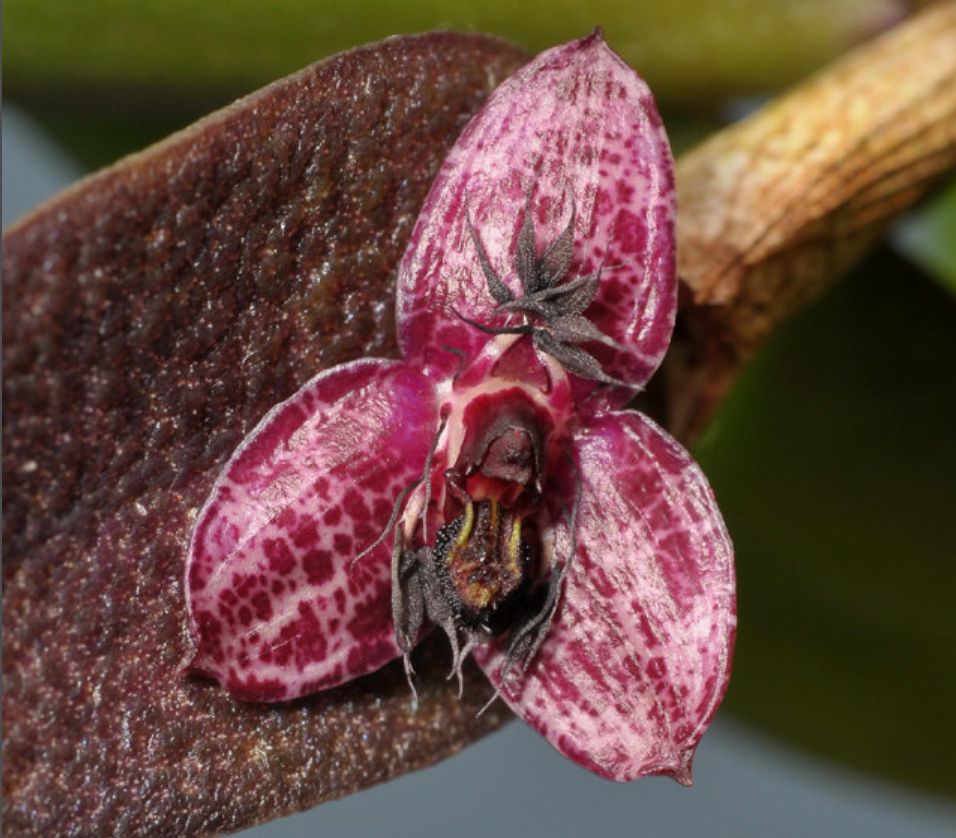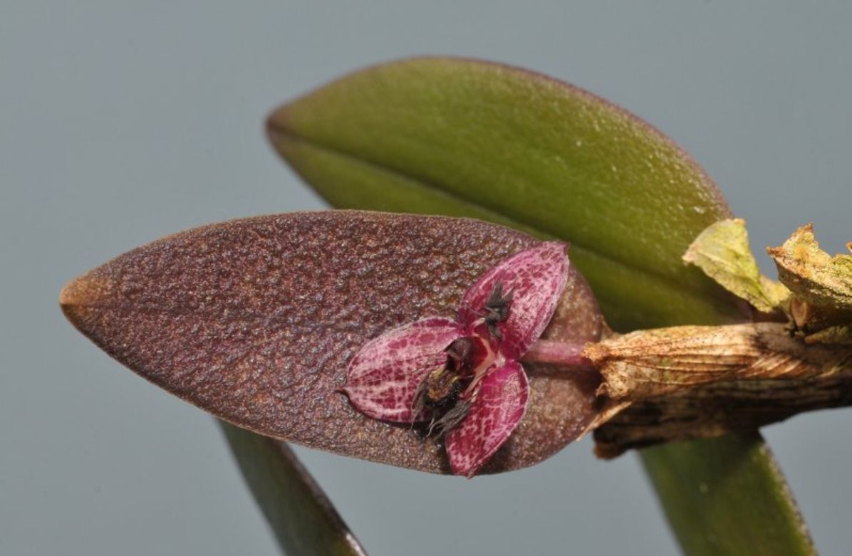 Found in the Bismark Archipelago in lower montane forests at eleavations around 850 meters as a mini-miniature sized, warm growing epiphyte with a stiffly patent to pendulous rhizome with persistent fibrous bracts, and .8" [2 cm] between each obovoid pseudobulb carrying a single, ovate, acute, abaxially rugose, subsessile base leaf that blooms in the late fall and early winter on a short, to 1" [2.5 cm] long, single flowered inflorescence with basally tubular, acute, shorter than the ovary floral bracts