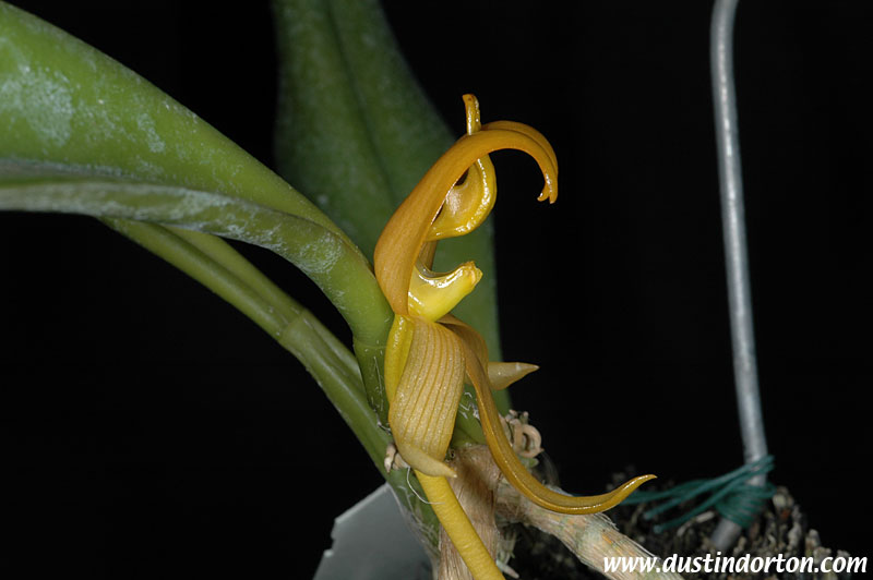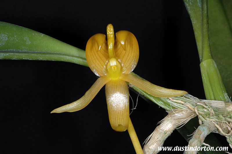 Found in Papua New Guinea in lowland rainforests as a small sized, hot to warm growing epiphyte on branches at the edge of the forest or on the lower trunks of large trees at elevations of 40 to 1200 meters with a thick, woody, bristle covered rhizome with 2" [5 cm] between each ovoid to cylindrical pseudobulbs enveloped basally by a ring of bristles and carrying a single, apical, oblong, channeled into a terete petiole basally, leathery, green to yellow green leaf that blooms in the fall through spring on a slender, arising from the rhizome between the pseudobulbs, a 1 1/8" to 3 5/8" [3 to 9 cm] long, inflorescence with 5 basal overlapping sheathing bracts giving rise to a solitary, fragrant [sweet honey], short lived [1 to 3 days] flower that has a moveable labellum.