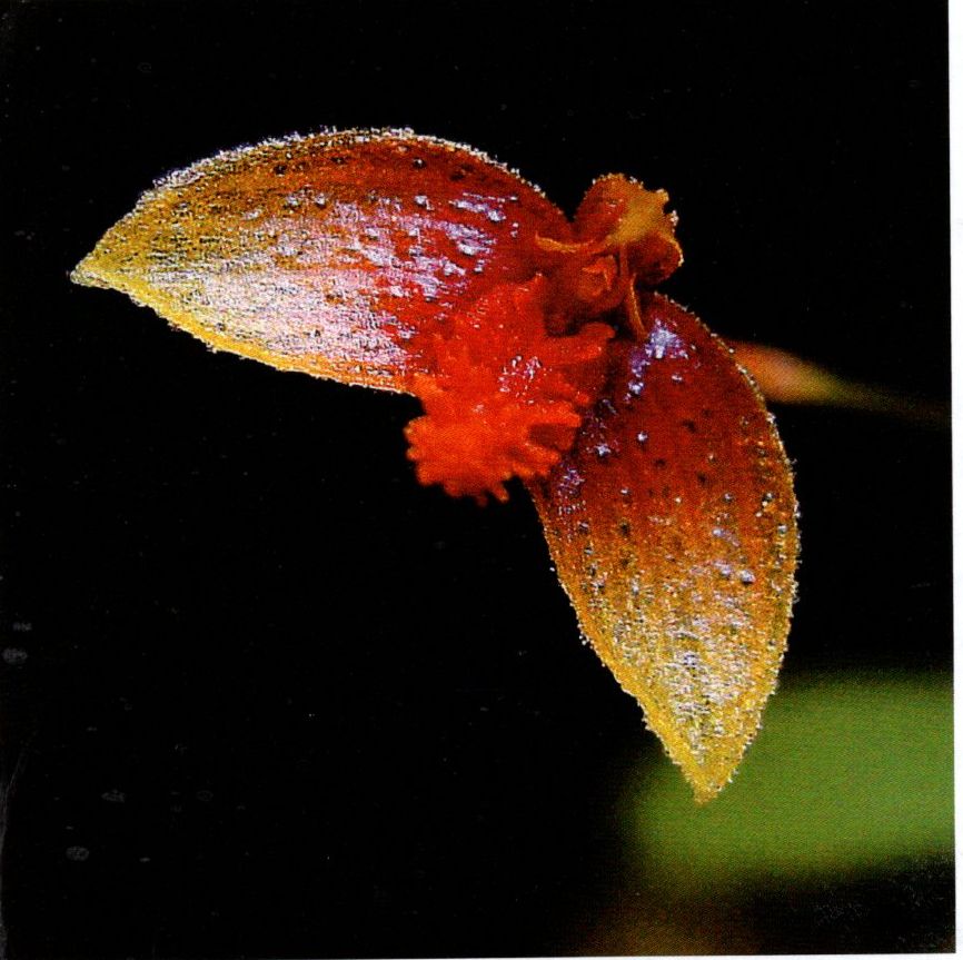 Found in Sulawesi in montane forest often on the bottom of thin branches of small trees at elevations of 1900 to 2500 meters as a mini-miniature sized, cold growing epiphyte with a creeping rhizome with .16 to .28" [.4 to .7 cm] between each, ovate, basal half prostrate on and fused to the rhizome, so that the new pseudobulbs arise c. half-way up the old pseudobulbs carrying a single, apical, erect, elliptic, obtuse, narrowing below into the petiolate base leaf that blooms in the fall and winter on a erect to patent, peduncle .72 to 1.12" [1.8 to 2.8 cm] long, provided with 2 bracts, the longest ca .072" [1.8 mm] long. 1.2 to 1.6" [3 to 4 cm] long, single flowered inflorescence carrying fully opening flowers.